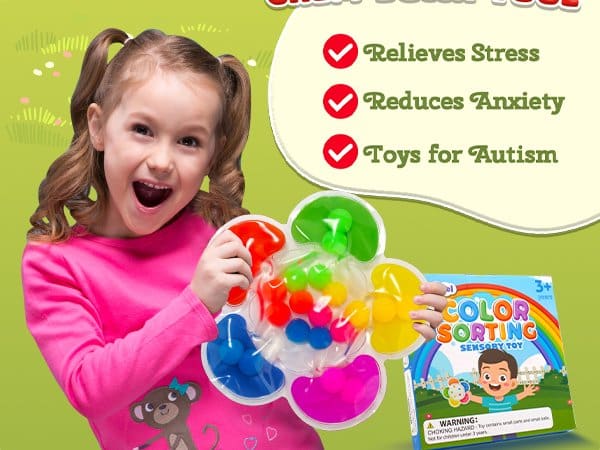 Fine Motor Color Sorting Toys: Flower-shaped color sorting toys that classify colors by squeezing and pressing different colored rubber beads and place them into the correct color to complete the color matching game. The educational tool are suitable for toddlers 3 4 5 years old and help them learn different colors, and early math. Through playing this lovely matching game, little kids can also enhance the fine motor skill and hand-eye coordination.