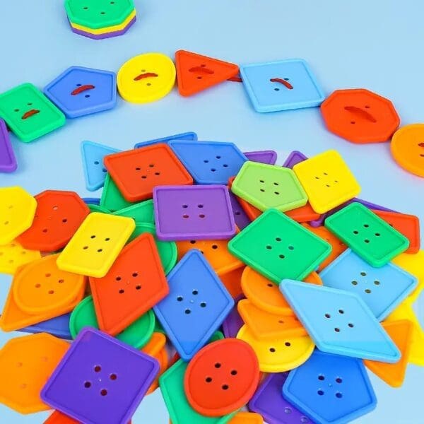 - Large plastic button lacing toy that Children can simply lace the large variety of buttons on the lace to make pretty jewelry, or they can sort or lace by color or button shape. Older children can create patterns with the colors and shapes.