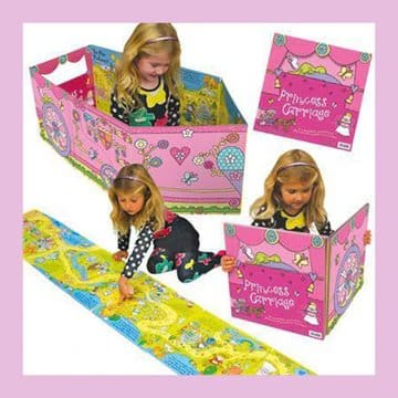 Convertible Princess Carriage is a fun storybook that can also be used as a playmat and a sit-in vehicle for toddlers. Once unfolded, parent and child can read the simple story, which describes Daisy’s journey from her cottage to the ball at the prince s palace. The illustrations include a host of favourite characters from fairytales and nursery rhymes. Laid on the floor, the book can also be used as a playmat. The boards can then be refolded into a large, sturdy princess carriage that a child can sit in and pretend to drive.