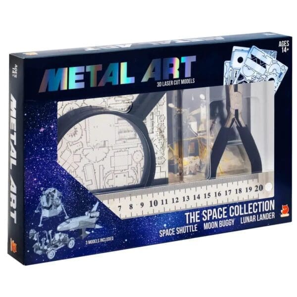 This set includes; 1 Space Shuttle model, 1 Moon Buggy model, 1 Lunar Lander model, needle nose pliers, magnifying glass, ruler and fun fact postcards.