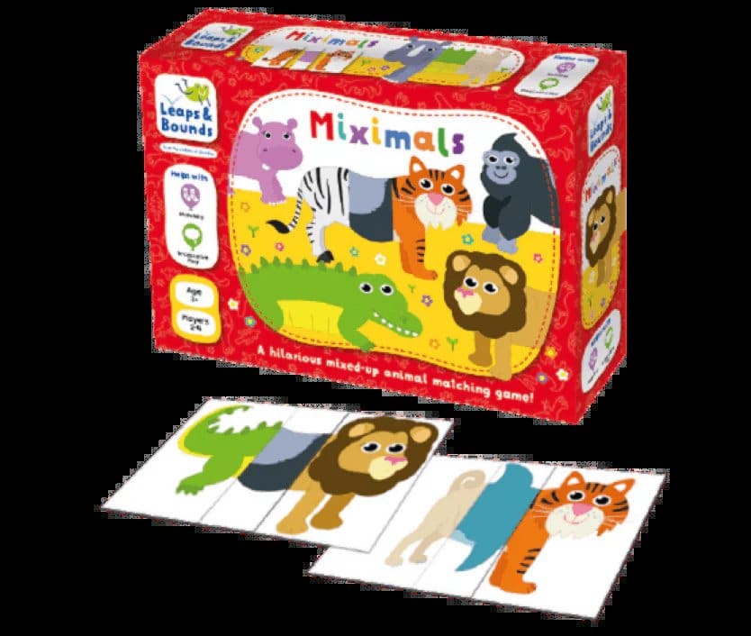 Miximals is the hilarious game that encourages children to create familiar and curious critters! Children can let their imaginations run wild, mixing up head, body and tail pieces or they can develop their sequencing and matching skills, creating the animals they know and love! The aim of the game is to be the first to complete 3 animals. First, spread out the cards face down. Each player takes 6 cards; 2 narrow cards (bodies) and 4 wider cards (heads/tails). then take turns to pick a new card. You can either keep it or put it back. If you keep it you must put back one of your other cards so that you never have more than 6 pieces. When you complete an animal, put it to one side and pick up another piece.