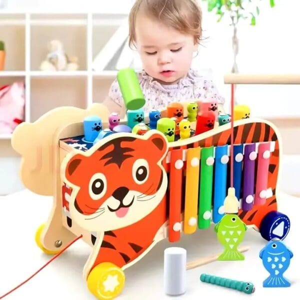 - The versatile toy includes several functions to practice fine motor skills, a classic hammering and pounding toy, magnetic fishing game, worm catching game, clock recognition, musical instrument and a tiger wooden car