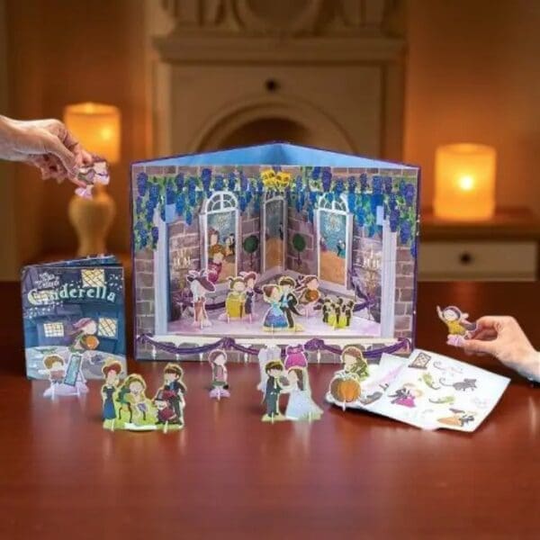Open the book and flip the stage downwards to construct your theatre. Use the re-usable stickers on the stage, the scenery, or even on the characters to add your own finishingtouches. Use the book to help you tell your story, or read it just for fun!